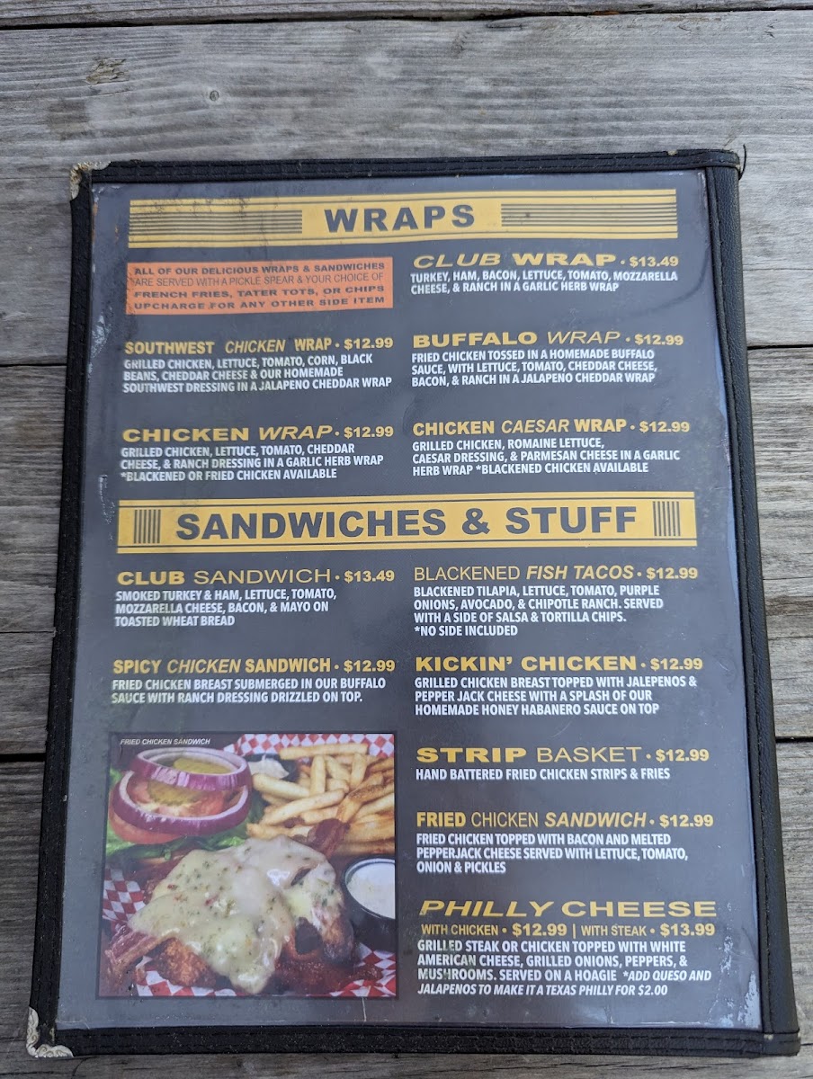 GRILLED STEAK OR CHICKEN TOPPED WITH WHITE AMERICAN CHEESE, GRILLED ONIONS, PEPPERS, & MUSHROOMS. SERVED ON A HOAGIE *ADD QUESO AND JALAPENOS TO MAKE IT A TEXAS PHILLY FOR 1.50